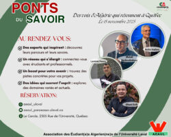 L’Association des étudiants et étudiantes Algériens de l’Université Laval (AEAUL) vous invite à sa grande conférence «Les Ponts du Savoir: Des voix d’Algérie qui résonnent à Québec». Venez rencontrer plus de 5 personnes professionnelles de renom au parcours exceptionnel et inspirant, qui partageront leurs expériences, parcours et conseils à travers 3 panels: