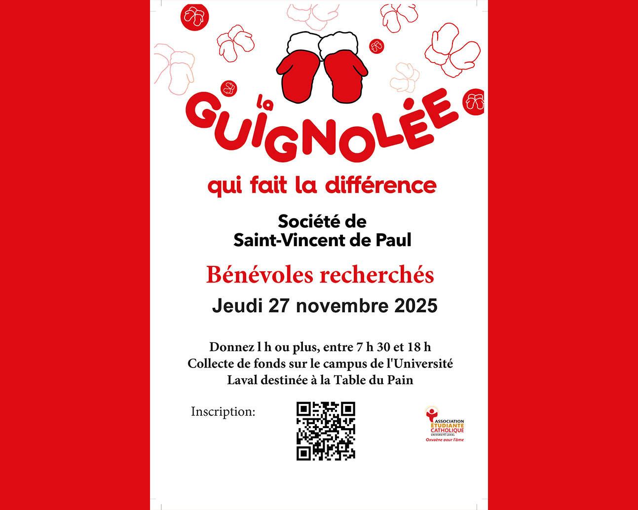 Le jeudi 27 novembre de 7h30 à 18h, participez à «La Guignolée étudiante» organisée par la Table du Pain en vue de soutenir son comptoir alimentaire.