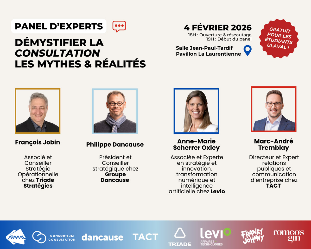 Le 4 février, joignez-vous à l’Association des participants à la maîtrise en administration de Laval (APMAL) pour un panel d’exception où des experts de firmes reconnues de la région de Québec viendront démystifier le métier, partager leur parcours et offrir des recommandations concrètes.