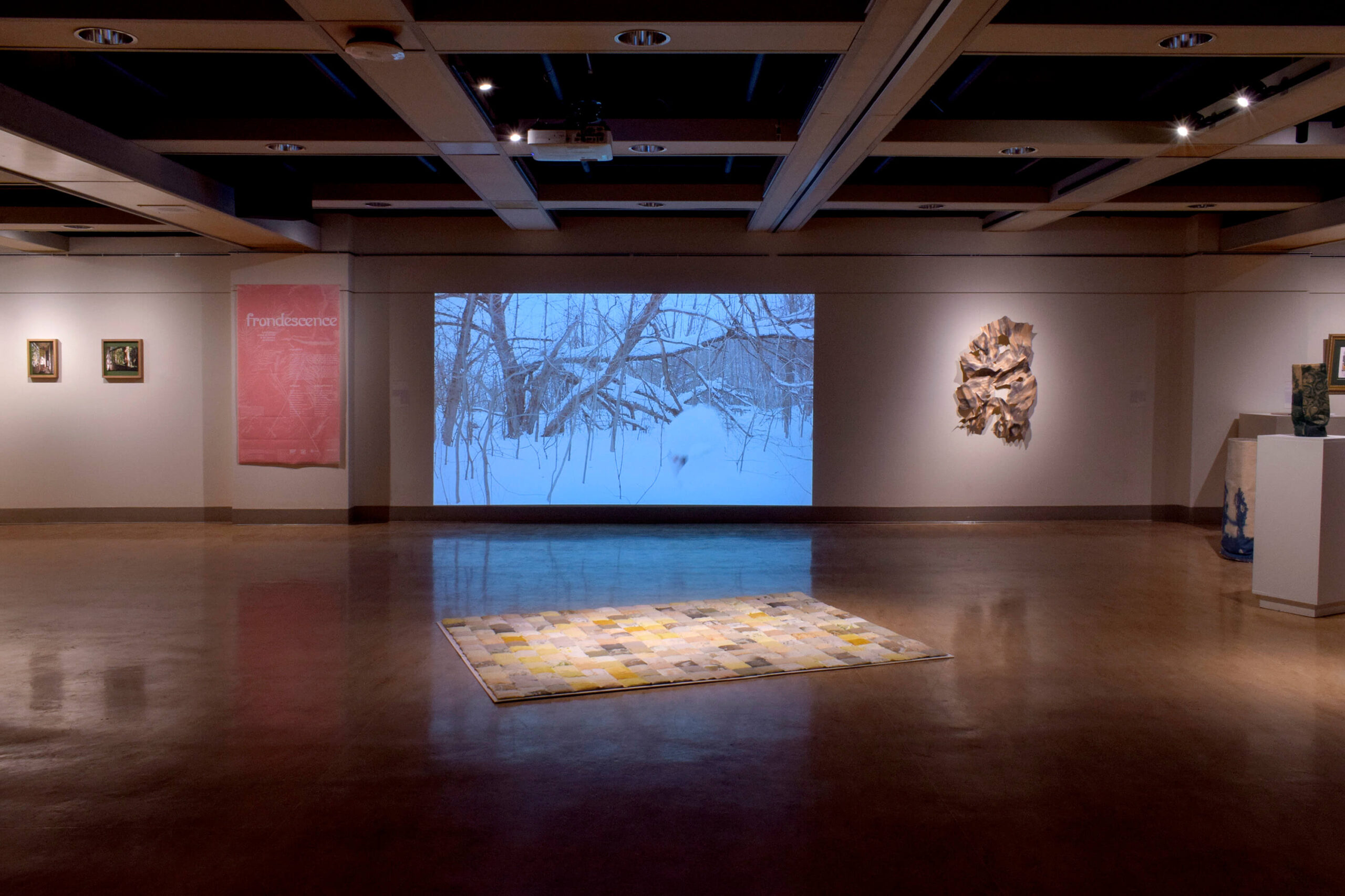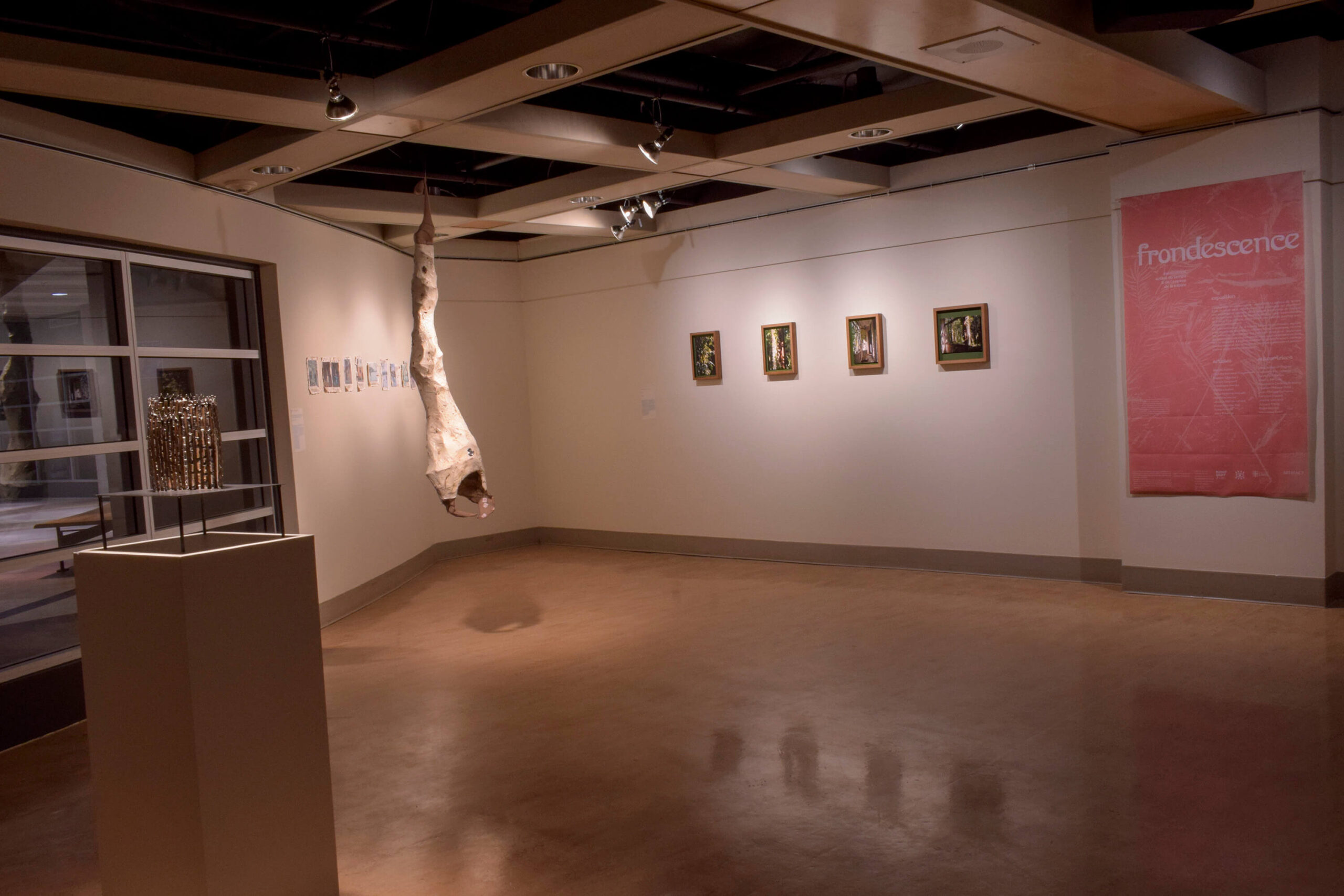 À l’ère de l’Anthropocène, nous reconnaissons qu’il peut être difficile d’entretenir une relation positive avec notre environnement. L’exposition Frondescence réunit des pratiques qui cherchent une expérience apaisée de la nature, à l’échelle de l’artiste et de ses sens. La frondescence, de la racine latine frons/frondis, signifie «se couvrir de feuillage», comme d’une couverture, comme les arbres au printemps. Ce concept évoque un renouveau après une période de dormance, mais aussi un processus doux, lent et rassurant. La thématique s’inspire d’expressions de la culture japonaise, telles que shinrin-yoku et nagori. La première signifie «bain de forêt» et renvoie à l’effet apaisant d’une promenade dans les bois, tandis que la deuxième se traduit par «l’empreinte des vagues» et évoque la nostalgie d’une saison qui s’achève. Les œuvres présentées explorent cette thématique par la sculpture, la photographie, le dessin, l’art textile, l’impression végétale, le livre d’artiste, ainsi que l’art vidéo et sonore. Elles présentent un moyen de penser la nature, ses lieux, ses paysages et ses rythmes de manière méditative et contemplative, mais aussi nostalgique, en faisant appel à tous nos sens.